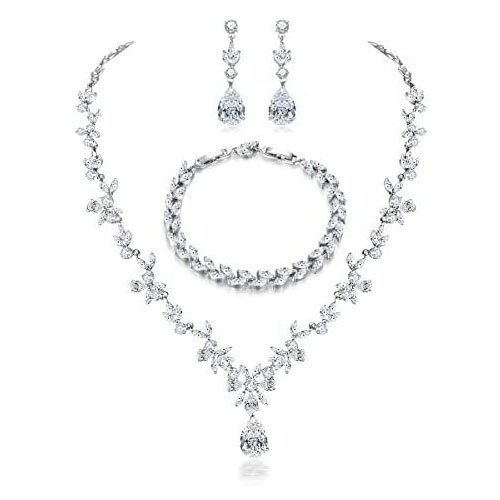 Hadskiss Jewelry Set for Women, Necklace Dangle Earrings Bracelet Set, White Gold Plated Jewelry Set with White AAA Cubic Zirconia, Allergy Free Wedding Party Jewelry for Bridal Bridesmaid