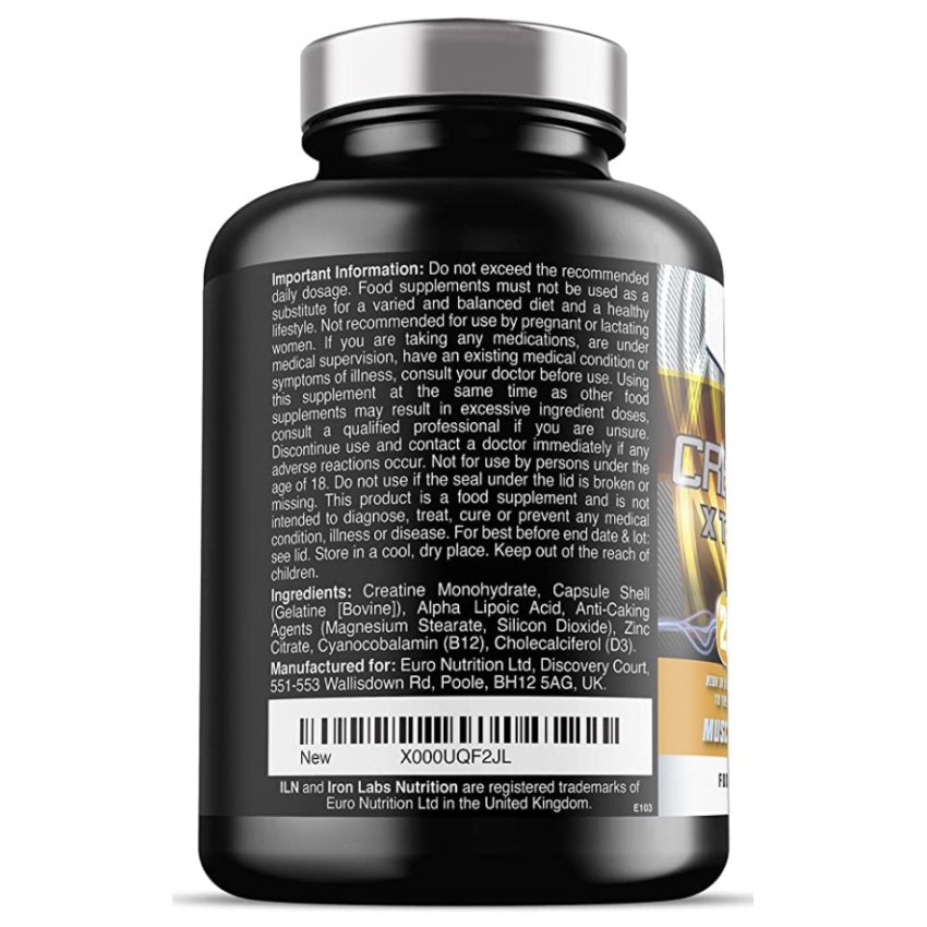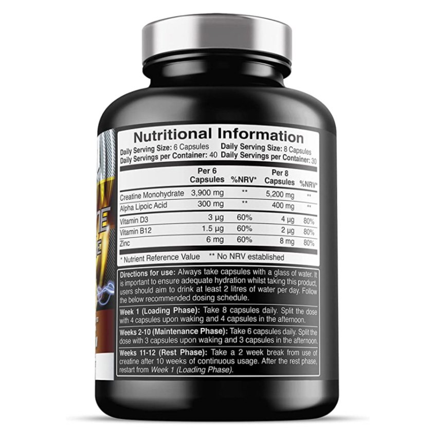 | Ingredients | Creatine Monohydrate, Capsule Shell (Gelatine [Bovine]), Alpha Lipoic Acid, Anti-Caking Agents (Magnesium Stearate, Silicon Dioxide), Zinc Citrate, Cyanocobalamin (0.1% Vitamin B12), Cholecalciferol (0.25% Vitamin D3).Creatine Monohydrate, Capsule Shell (Gelatine [Bovine]), Alpha Lipoic Acid, Anti-Caking Agents (Magnesium Stearate, Silicon Dioxide), Zinc Citra… See more |