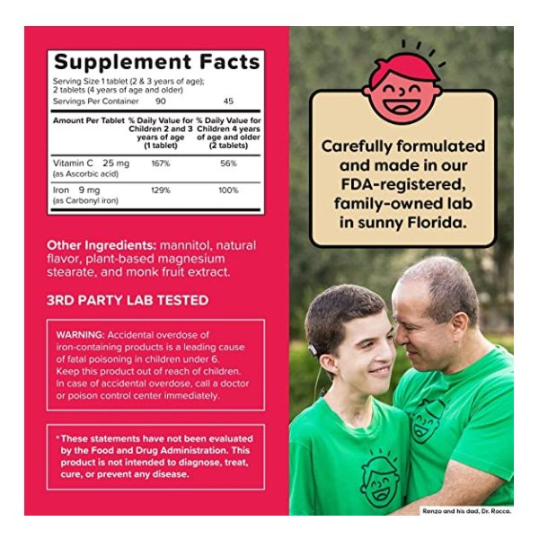 | Ingredients | Vitamin C (as ascorbic acid), Iron (as carbonyl iron), mannitol, natural flavor, magnesium vegetable stearate, and monk fruit extractVitamin C (as ascorbic acid), Iron (as carbonyl iron), mannitol, natural flavor, magnesium vegetable stearate, and monk fruit extract |