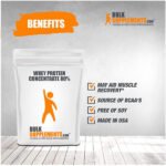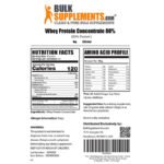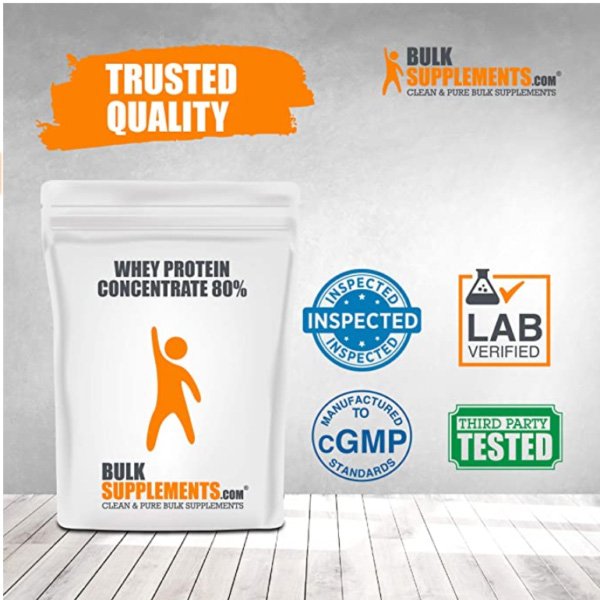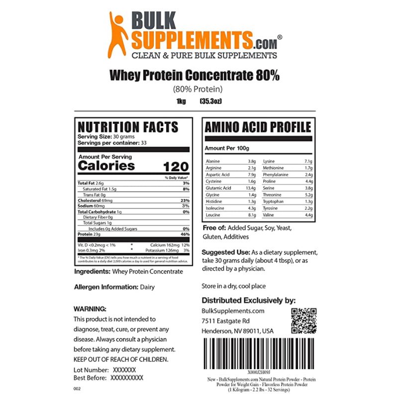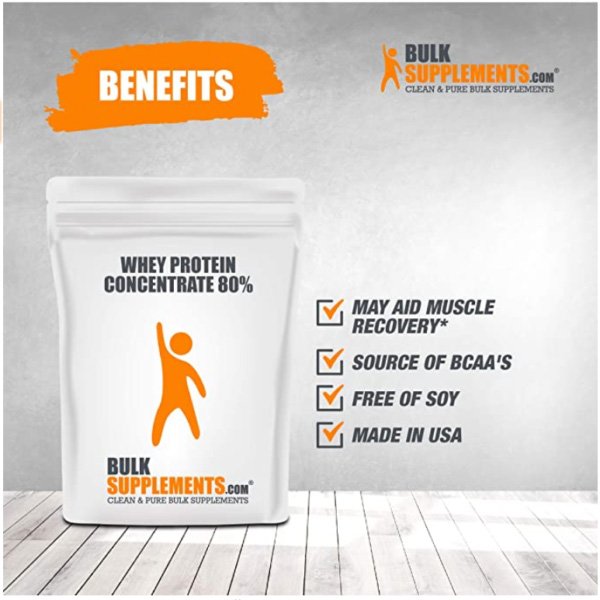 Boost Muscle Gains by Whey Protein Concentrate Powder by BulkSupplements!* Maximize your athletic performance, build muscle, and reduce post-workout fatigue; our whey protein isolate will help you make the most out of your bodybuilding, strength training, or high-intensity workouts.* Whey can be processed and isolated into three different types of protein: whey protein isolate, whey protein concentrate and whey protein hydrolysate.* Whey Concentrate is the purest form, as its water, fat, and lactose content have been removed, and it contains more about 80% protein per serving. Whey Concentrate is a rich source branched chain amino acids (BCAAs), which are leucine, valine and isoleucine, and essential amino acids that are largely found in muscle tissues and primarily used in protein synthesis. Because this protein powder contains no artificial flavorings or sweeteners of any kind, it may have a milky, somewhat bland taste. If desired, add sweeteners or flavoring of your choice to your whey protein drink to remedy this. Seal this unflavored protein powder well and store in a cool, dry place away from heat and moisture to preserve its freshness and taste.