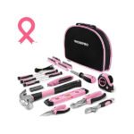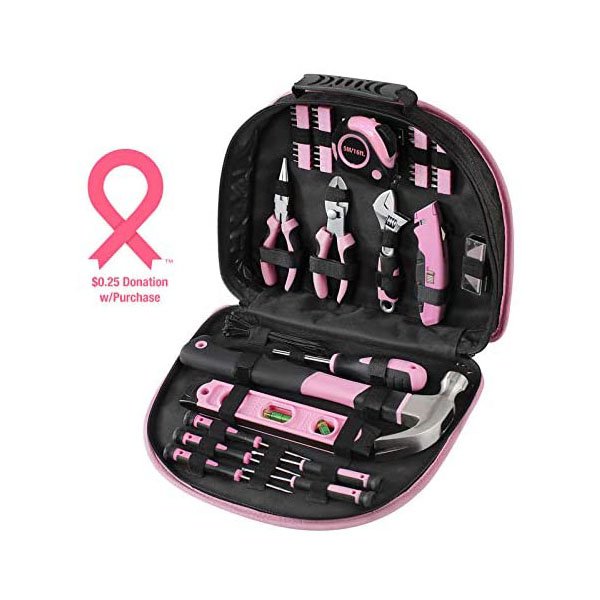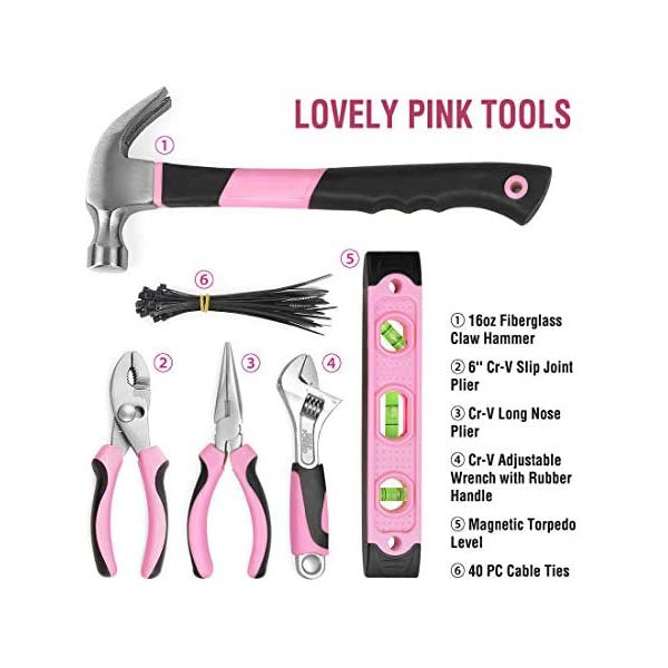 103 – Piece Pink Tool Set – This tool set comes with all the most useful and necessary tools for home maintenance and daily use. It includes a hammer, level, pliers, magnetic screwdrivers and bits, wrenches, cable ties,utility knife and much more
